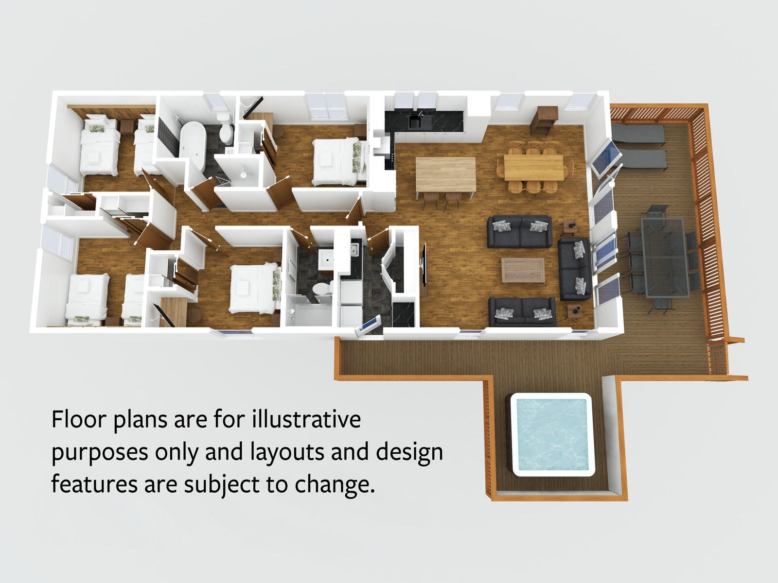 The Spinney 4 Spa lodge includes two master bedrooms with king size bed and two twin bedrooms all with flatscreen TVs. There is a luxurious family bathroom with freestanding bath and separate shower and a further shower room with generous shower enclosure. The fully equipped kitchen includes a coffee machine, wine cooler, dishwasher and fridge freezer. The spacious and stylish living space includes a dining table, comfy sofas and features a large flatscreen TV and Chromecast for streaming and there are large feature windows to enjoy the woodland views. The lodge has a large gated veranda with quality outdoor seating. The dog friendly utility room has a washing machine and a tumble dryer alongside outdoor washing facilities for muddy boots and muddy paws! The stable doors separate the utility area from both the decking and the internal living space enabling you to keep your dog safe and secure. The lodges all feature a gated spacious veranda with quality outdoor dining furniture, two sun loungers and an indulgent outdoor hot tub. Two robes are provided in the master bedrooms. Free Wi-Fi. Two dogs allowed. Early check-in of 3pm.