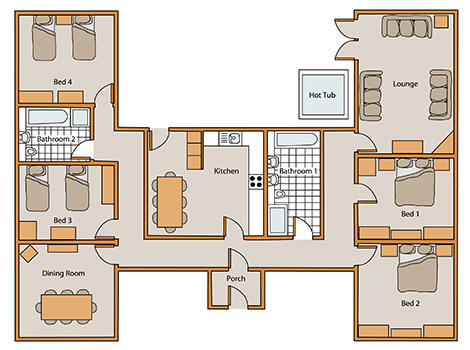 The living accommodation has a fully equipped, spacious kitchen with coffee machine, fridge / freezer, microwave oven and dishwasher – everything you need should you want to prepare that special family meal. The large dining table comfortably seats eight and the living room has a flat screen TV with freeview and DVD player for when you want to relax and enjoy a night in with family or friends. There is also a Chrome Cast in the main living area to enable you to Stream online TV Services such as Netflix from your device. Free Wi-Fi. (Please read the FAQs for details). The cottage features a spacious patio with quality outdoor dining furniture, two sun loungers and an indulgent outdoor hot tub.