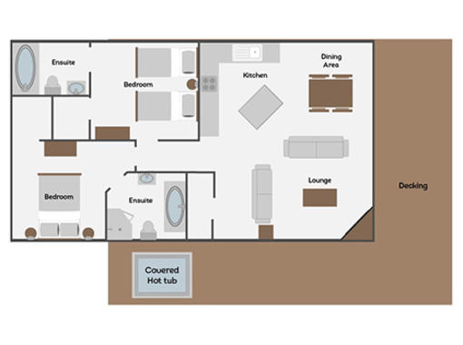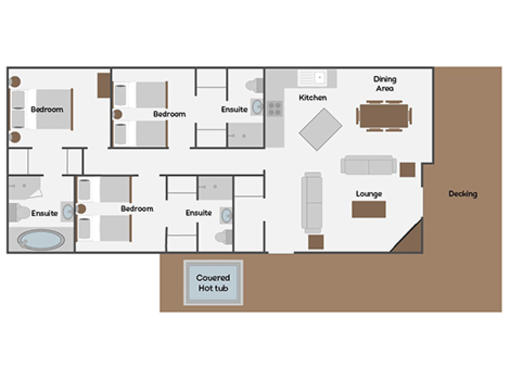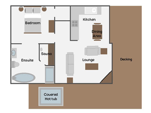 The Spinney Exclusive Spa lodges are available with 1, 2 and 3 bedrooms high specification interiors and appliances. One of the unique features of the Spinney Exclusive lodges is that they benefit from having a canopy over the indulgent outdoor hot tub so that you can enjoy relaxing outside, no matter what the weather. The Spinney Exclusive lodges do not accept pets.
